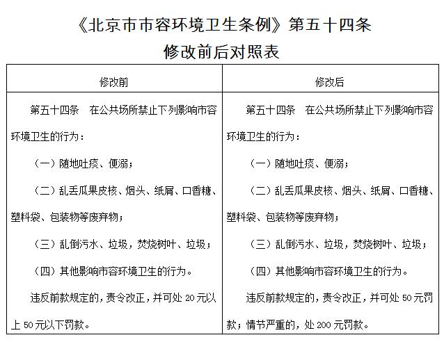 针对上述问题,法制委员会建议同步修改《北京市市容环境卫生条例》,将第五十四条对随地吐痰、便溺,乱丢废弃物,乱倒垃圾等行为的罚款额度由20元以上50元以下,提高到50元、情节严重的200元,表述为:“在公共场所禁止下列影响市容环境卫生的行为: