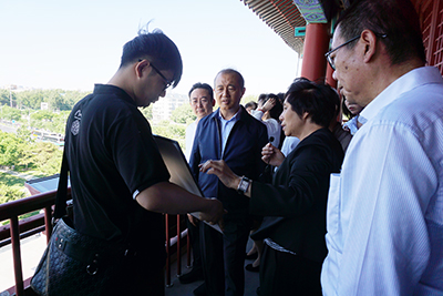 调研组在先农坛参观了“先农坛历史文化展览”,视察了先农坛“一亩三分地”恢复工程,详细了解先农坛历史格局、文物保护现状以及庆成宫不合理使用情况;在永定门城楼,视察了中轴线南段文物保护情况和南中轴地区周边环境治理情况,详细了解永定门历史和中轴线南段综合整治重点任务;在天坛公园,视察了公园西南部原园林机械厂区域和五八二电台线杆占用区域,详细了解文物腾退、环境整治以及广利门和南内坛墙修缮情况。