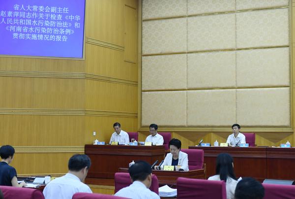 7月22日,河南省十三届人大常委会第十一次会议听取关于检查《中华人民共和国水污染防治法》和《河南省水污染防治条例》贯彻实施情况的报告。会上,河南省人大常委会党组书记、副主任赵素萍代表省人大常委会作报告。