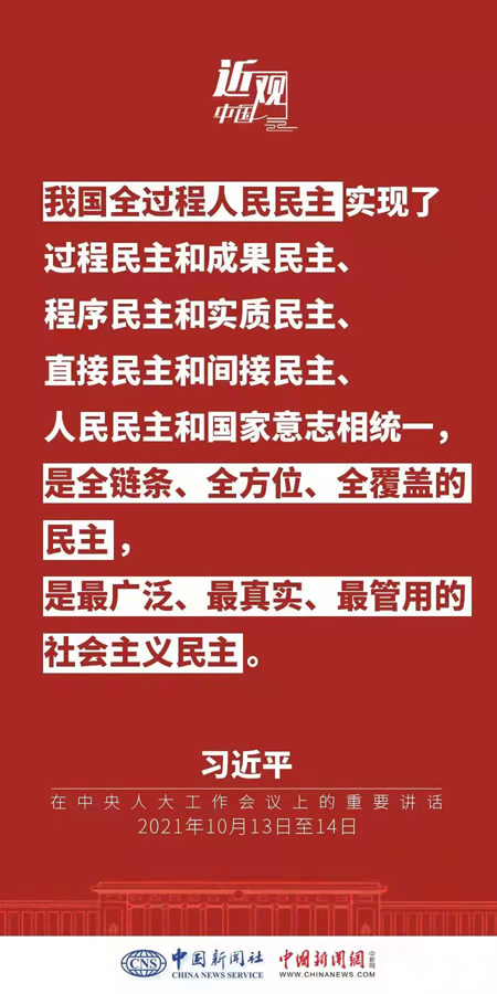 他指出:“我国全过程人民民主实现了过程民主和成果民主、程序民主和实质民主、直接民主和间接民主、人民民主和国家意志相统一,是全链条、全方位、全覆盖的民主,是最广泛、最真实、最管用的社会主义民主。”
